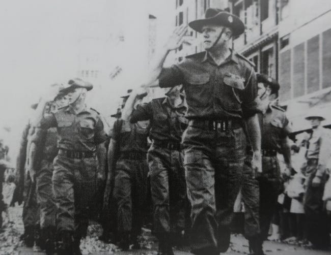 Major Phil Pritchard leading Admin Company, 8RAR through the streets of Brisbane immediately following their tour in Vietnam - it was the last time he served on active service (The Grey Eight in Focus)A young second lieutenant recalled, looking back on his time serving under Phil Pritchard, as follows: